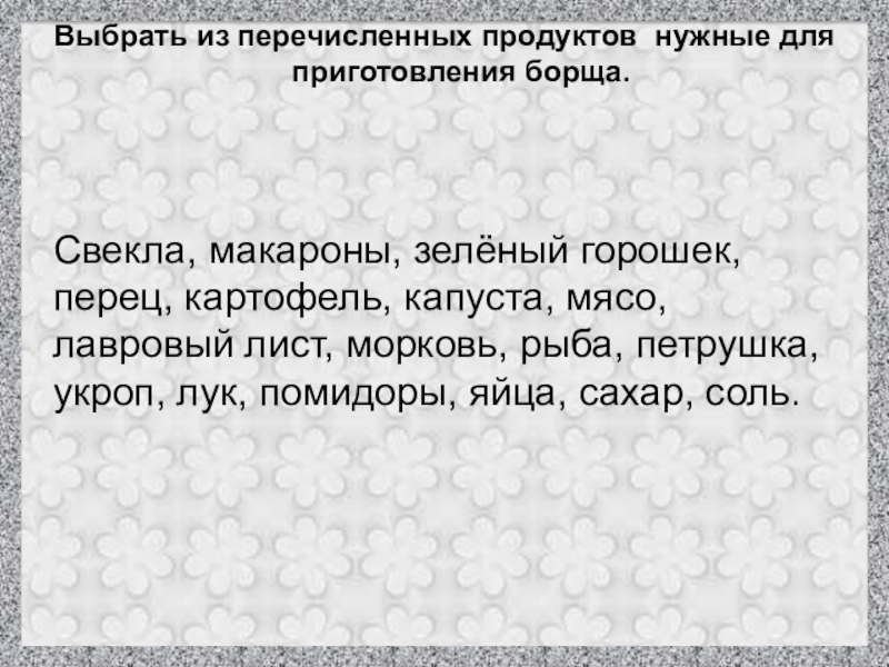 Слайд 14Выбрать из перечисленных продуктов нужные для приготовления борща.