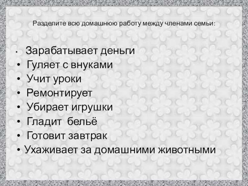 Слайд 13Разделите всю домашнюю работу между членами семьи: