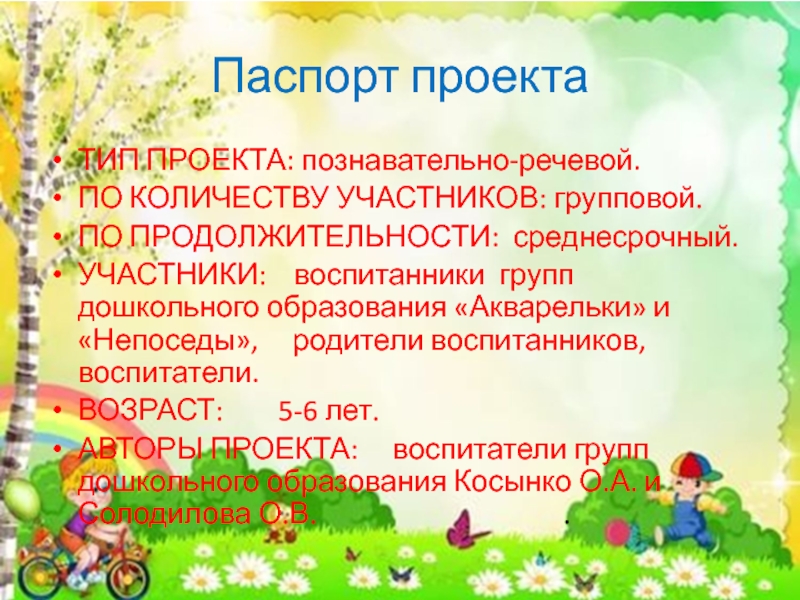 АВТОРЫ ПРОЕКТА: воспитатели групп дошкольного образования Косынко О.А. и Солодилова О.В. .