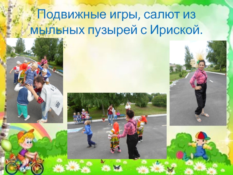 Слайд 18Подвижные игры, салют из мыльных пузырей с Ириской.