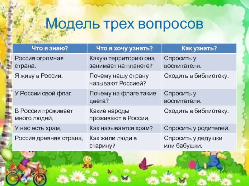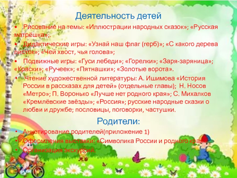 Чтение художественной литературы: А. Ишимова «История России в рассказах для детей» (отдельные главы); Н. Носов «Метро»; П. Воронько «Лучше нет родного края»; С. Михалков «Кремлёвские звёзды»; «Россия»; русские народные сказки о любви и дружбе; пословицы, поговорки, частушки.