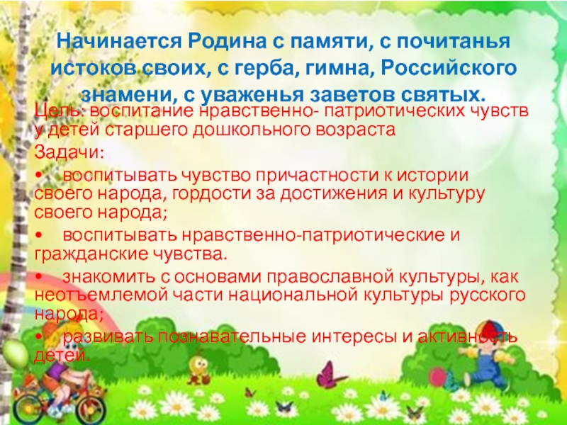 православным традициям, любви к родному краю; Формировать первоначальные представления, о государственной символике.