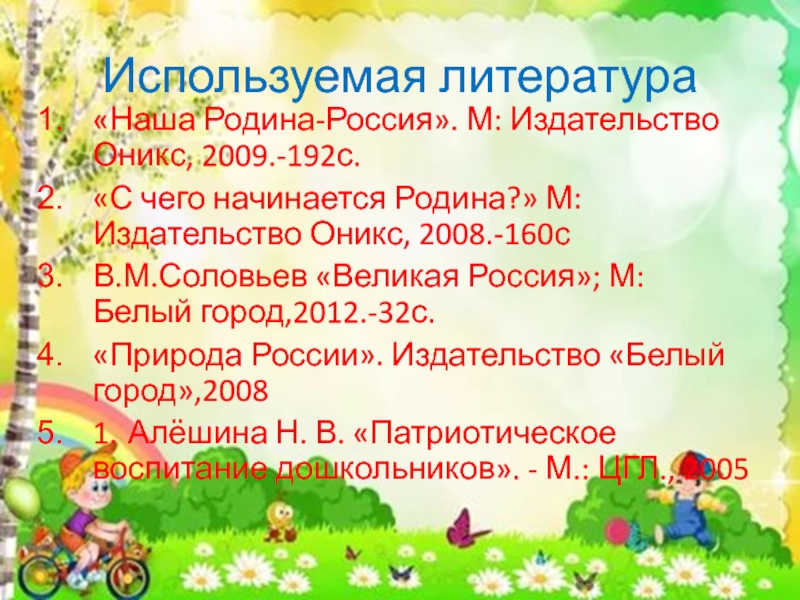1. Алёшина Н. В. «Патриотическое воспитание дошкольников». - М.: ЦГЛ., 2005