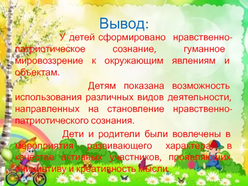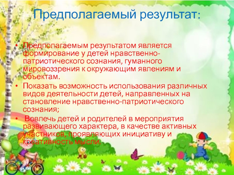 Предполагаемым результатом является формирование у детей нравственно-патриотического сознания, гуманного мировоззрения