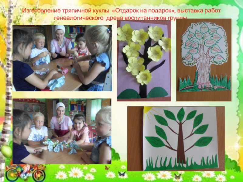 Слайд 13Изготовление тряпичной куклы «Отдарок на подарок», выставка работ генеалогического древа воспитанников