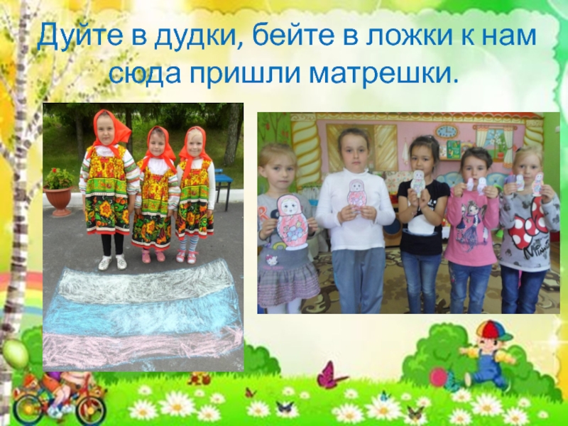 Слайд 19Дуйте в дудки, бейте в ложки к нам сюда пришли матрешки.