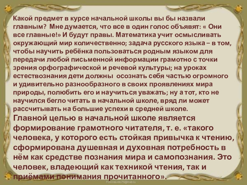 Главной целью в начальной школе является формирование грамотного читателя, т. е. «такого человека, у которого есть стойкая привычка к чтению, сформирована душевная и духовная потребность в нём как средстве познания мира и самопознания. Это человек, владеющий как техникой чтения, так и приёмами понимания прочитанного».