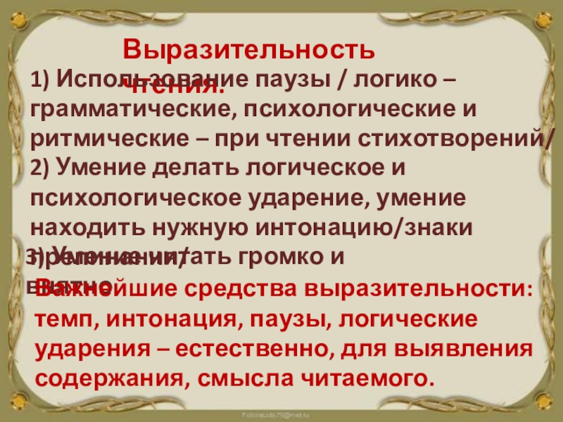 Важнейшие средства выразительности: темп, интонация, паузы, логические ударения – естественно, для выявления содержания, смысла читаемого.