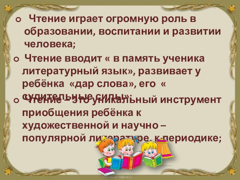 Чтение – это уникальный инструмент приобщения ребёнка к художественной и научно – популярной литературе, к периодике;
