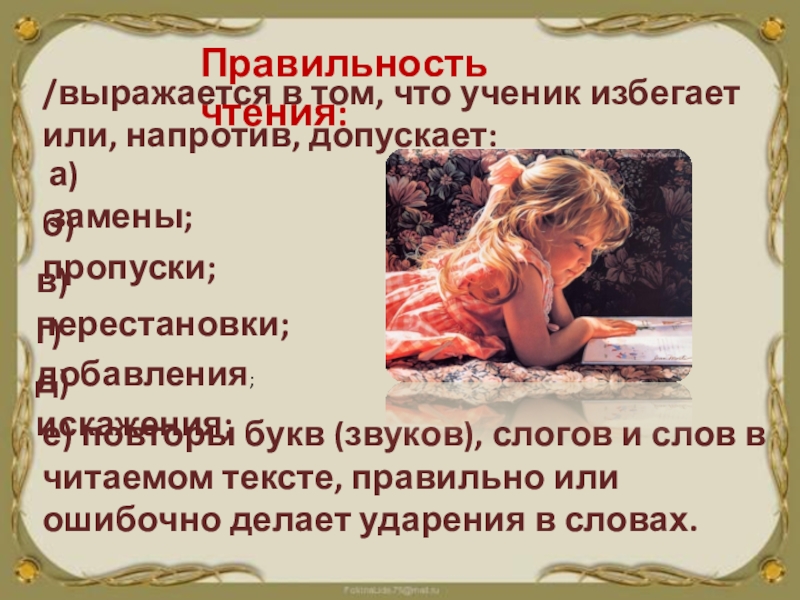 е) повторы букв (звуков), слогов и слов в читаемом тексте, правильно или ошибочно делает ударения в словах.