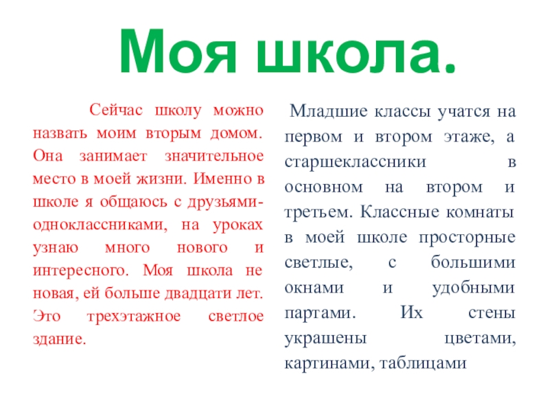 Младшие классы учатся на первом и втором этаже, а старшеклассники в основном на втором и третьем. Классные комнаты в моей школе просторные светлые, с большими окнами и удобными партами. Их стены украшены цветами, картинами, таблицами