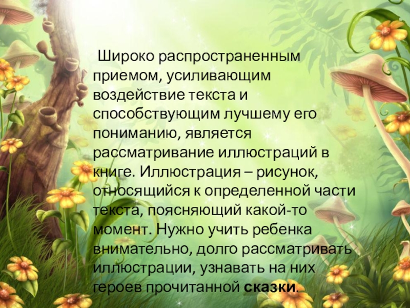 пониманию, является рассматривание иллюстраций в книге. Иллюстрация – рисунок, относящийся к определенной части текста, поясняющий какой-то момент. Нужно учить ребенка внимательно, долго рассматривать иллюстрации, узнавать на них героев прочитанной сказки.