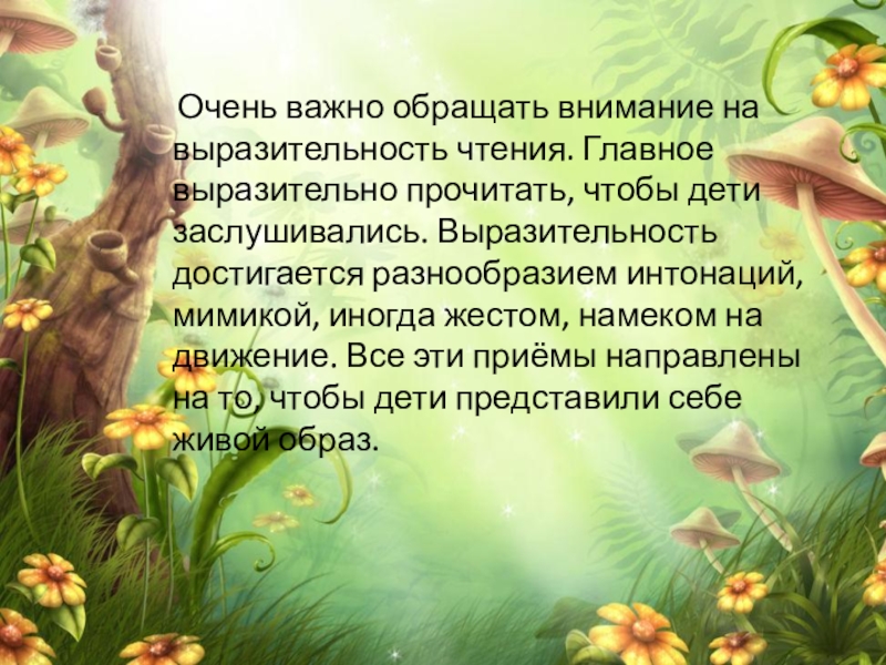 чтобы дети заслушивались. Выразительность достигается разнообразием интонаций, мимикой, иногда жестом, намеком на движение. Все эти приёмы направлены на то, чтобы дети представили себе живой образ.