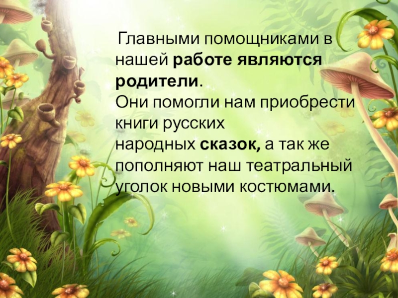 Главными помощниками в нашей работе являются родители.Они помогли нам приобрести книги русских народных сказок, а так же пополняют