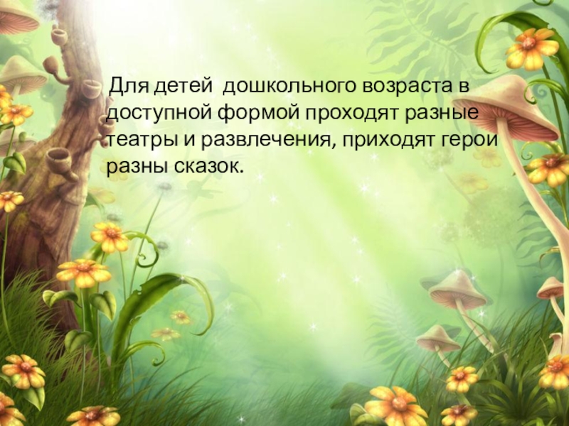 Для детей дошкольного возраста в доступной формой проходят разные театры и развлечения, приходят герои разны сказок.