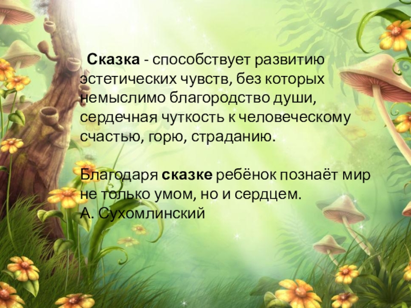 Слайд 3 Сказка - способствует развитию эстетических чувств, без которых немыслимо благородство