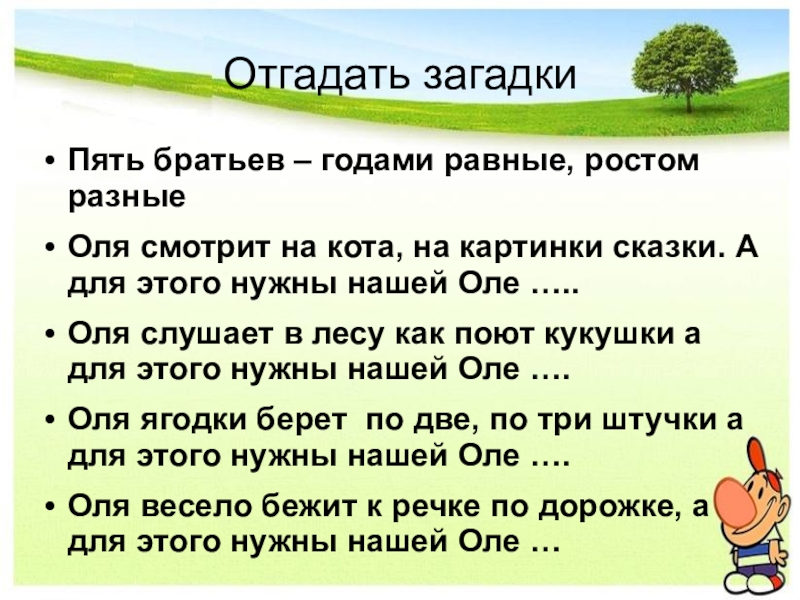 Отгадать загадкиПять братьев – годами равные, ростом разныеОля смотрит на кота, на картинки сказки. А для этого