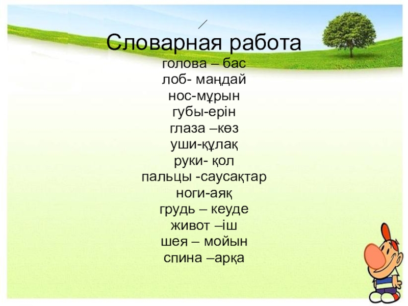 Слайд 3 Словарная работа голова – бас лоб- маңдай нос-мұрын губы-ерін глаза –көз уши-құлақ руки- қол пальцы -саусақтар ноги-аяқ грудь – кеуде живот