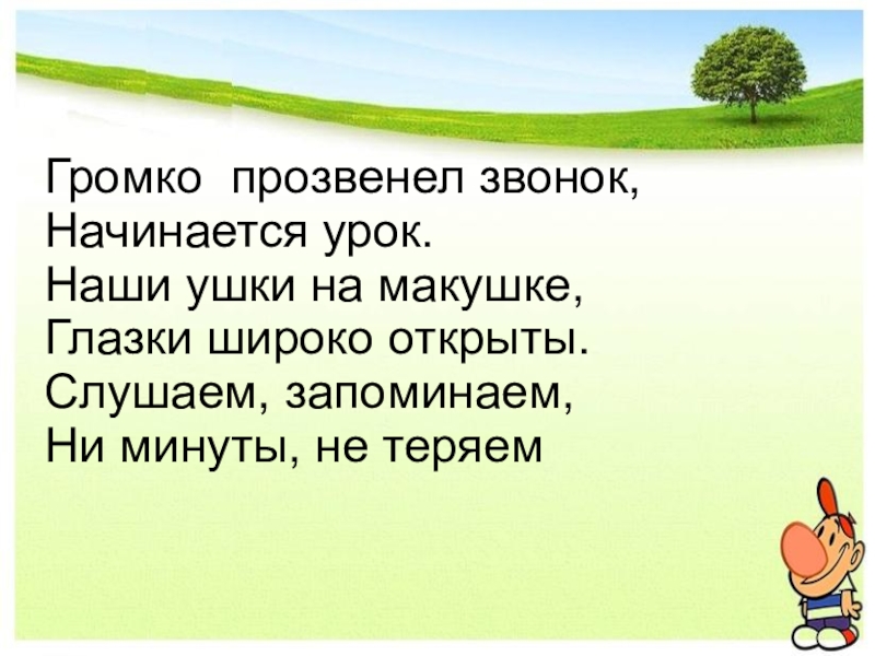 Слайд 2 Громко прозвенел звонок, Начинается урок. Наши ушки на макушке, Глазки широко открыты. Слушаем, запоминаем, Ни минуты,