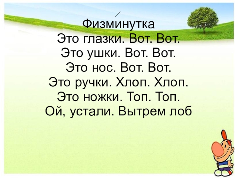 Слайд 5Физминутка Это глазки. Вот. Вот. Это ушки. Вот. Вот. Это нос. Вот.