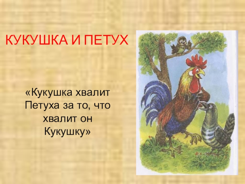 КУКУШКА И ПЕТУХ«Кукушка хвалит Петуха за то, что хвалит он Кукушку»