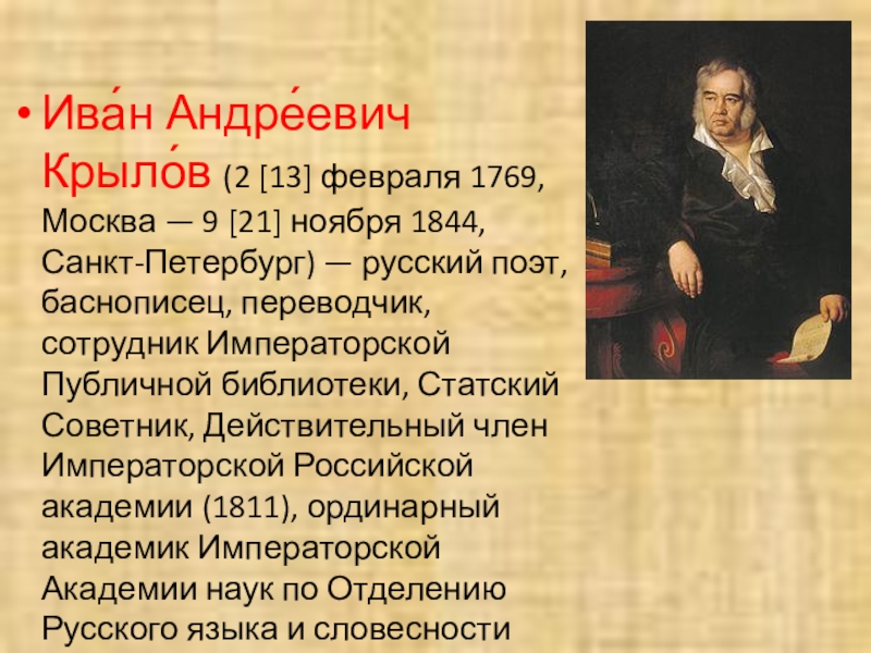 Слайд 2Ива́н Андре́евич Крыло́в (2 [13] февраля 1769, Москва — 9 [21]