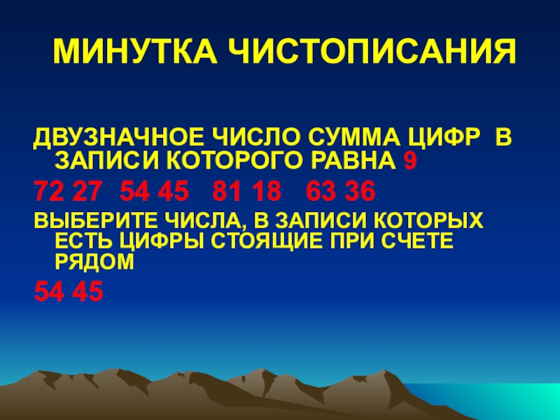МИНУТКА ЧИСТОПИСАНИЯДВУЗНАЧНОЕ ЧИСЛО СУММА ЦИФР В ЗАПИСИ КОТОРОГО РАВНА 972 27 54 45 81 18 63 36 ВЫБЕРИТЕ ЧИСЛА, В ЗАПИСИ КОТОРЫХ ЕСТЬ ЦИФРЫ СТОЯЩИЕ ПРИ СЧЕТЕ РЯДОМ54 45