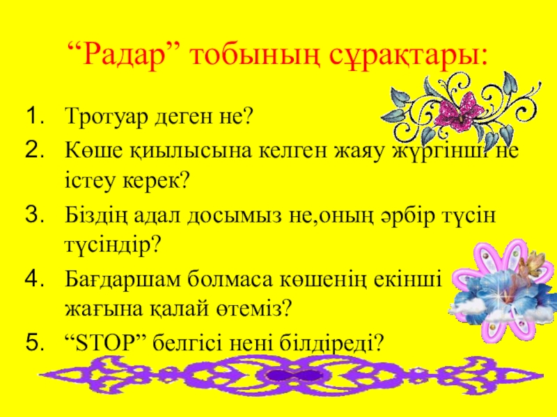 “Радар” тобының сұрақтары:Тротуар деген не?Көше қиылысына келген жаяу жүргінші не істеу керек?Біздің адал досымыз не,оның әрбір түсін