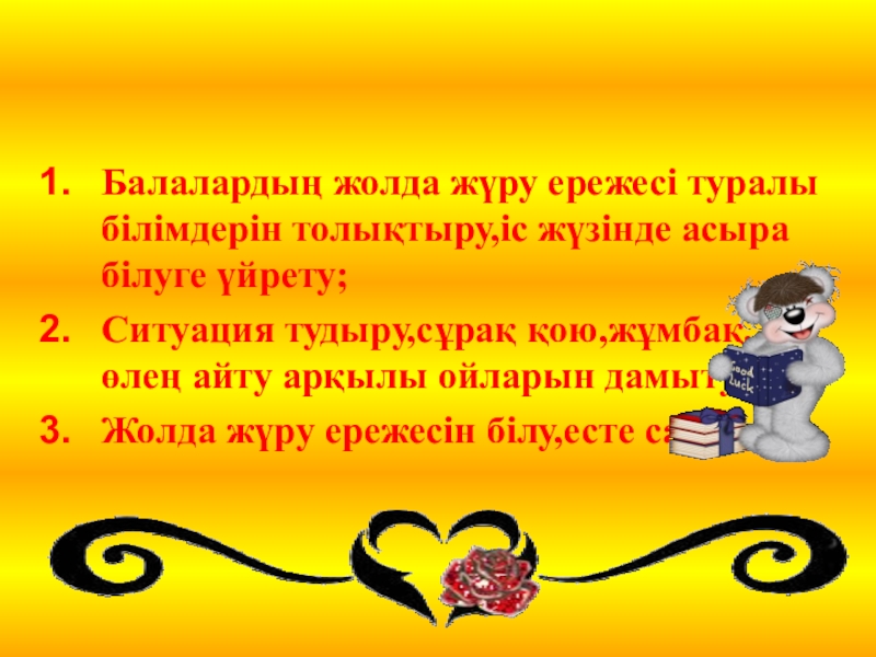 Сабақтың мақсаты:Балалардың жолда жүру ережесі туралы білімдерін толықтыру,іс жүзінде асыра білуге үйрету;Ситуация тудыру,сұрақ қою,жұмбақ,өлең айту арқылы ойларын