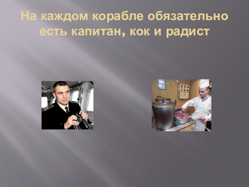 Слайд 8На каждом корабле обязательно есть капитан, кок и радист
