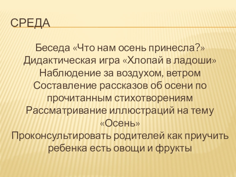 СредаБеседа «Что нам осень принесла?»Дидактическая игра «Хлопай в ладоши»Наблюдение за воздухом, ветромСоставление рассказов об осени по прочитанным