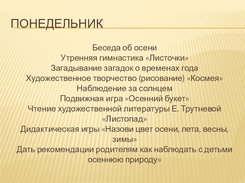 ПонедельникБеседа об осениУтренняя гимнастика «Листочки»Загадывание загадок о временах годаХудожественное творчество (рисование) «Космея»Наблюдение за солнцемПодвижная игра «Осенний букет»Чтение художественной литературы Е. Трутневой «Листопад»Дидактическая игры «Назови цвет осени, лета, весны, зимы»Дать рекомендации родителям как наблюдать с детьми осеннюю