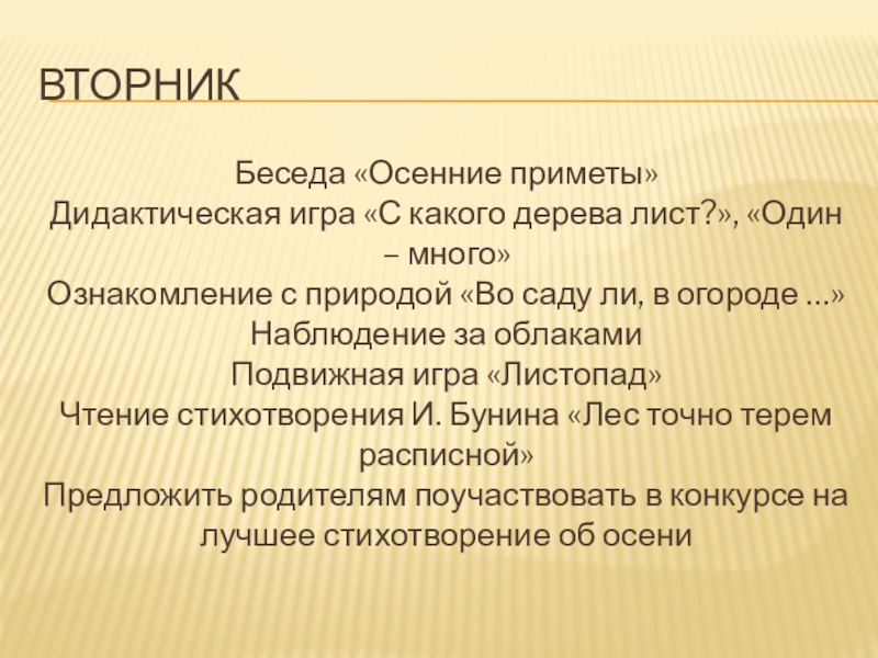 вторникБеседа «Осенние приметы»Дидактическая игра «С какого дерева лист?», «Один – много»Ознакомление с природой «Во саду ли, в