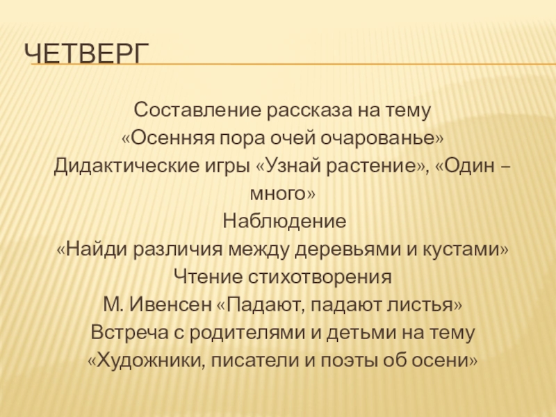 ЧетвергСоставление рассказа на тему «Осенняя пора очей очарованье»Дидактические игры «Узнай растение», «Один – много» Наблюдение «Найди различия