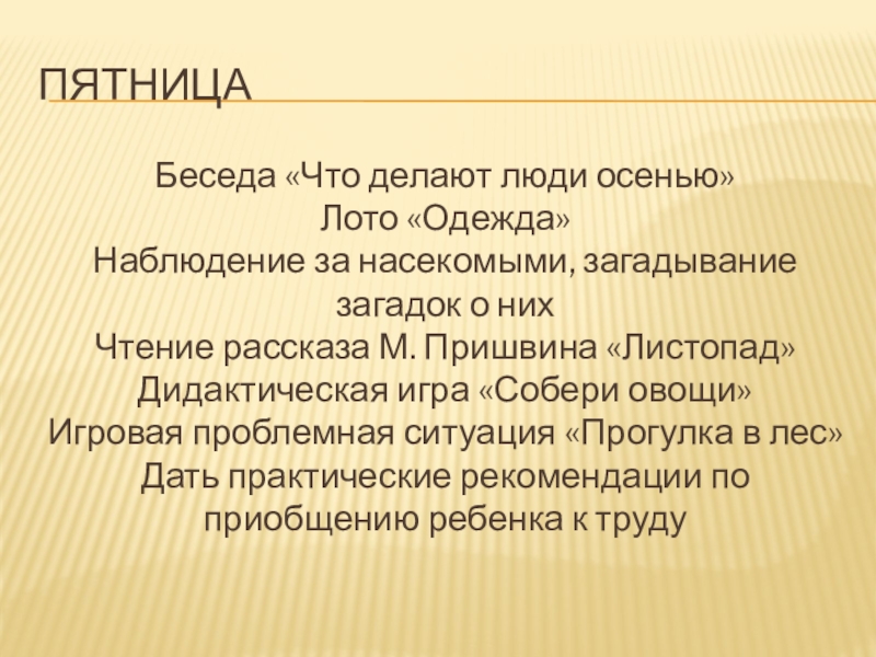 ПятницаБеседа «Что делают люди осенью»Лото «Одежда»Наблюдение за насекомыми, загадывание загадок о нихЧтение рассказа М. Пришвина «Листопад»Дидактическая игра