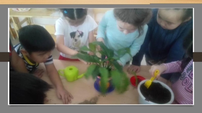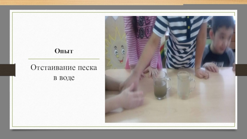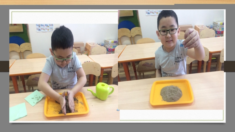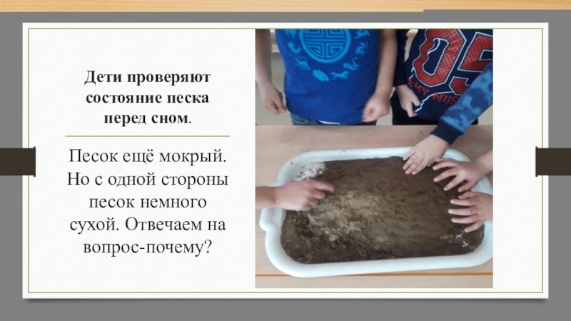 Дети проверяют состояние песка перед сном.Песок ещё мокрый. Но с одной стороны песок немного сухой. Отвечаем на