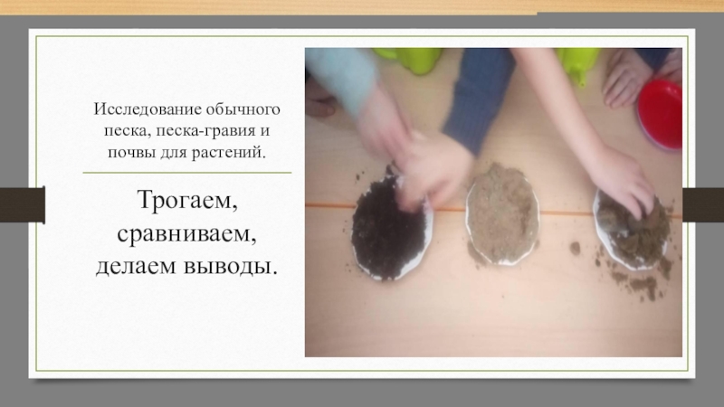Исследование обычного песка, песка-гравия и почвы для растений.Трогаем,сравниваем,делаем выводы.
