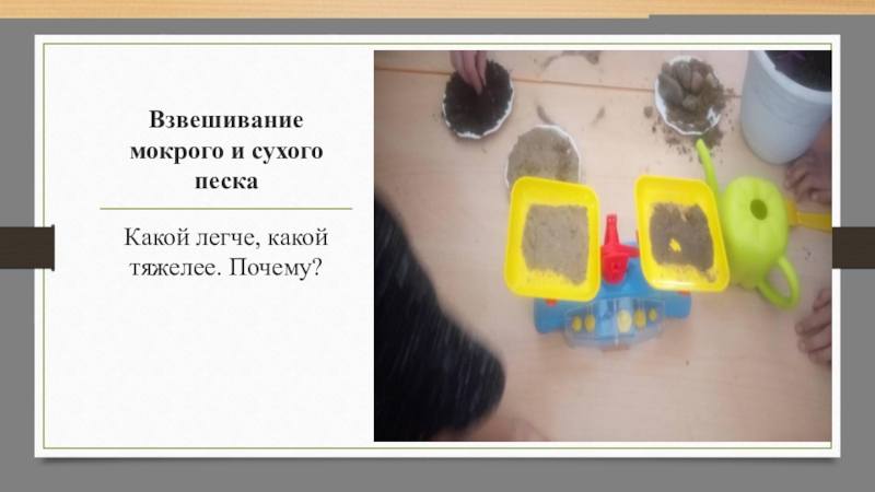 Взвешивание мокрого и сухого пескаКакой легче, какой тяжелее. Почему?