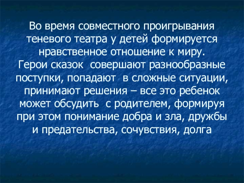 Слайд 4 Во время совместного проигрывания теневого театра у детей формируется нравственное отношение