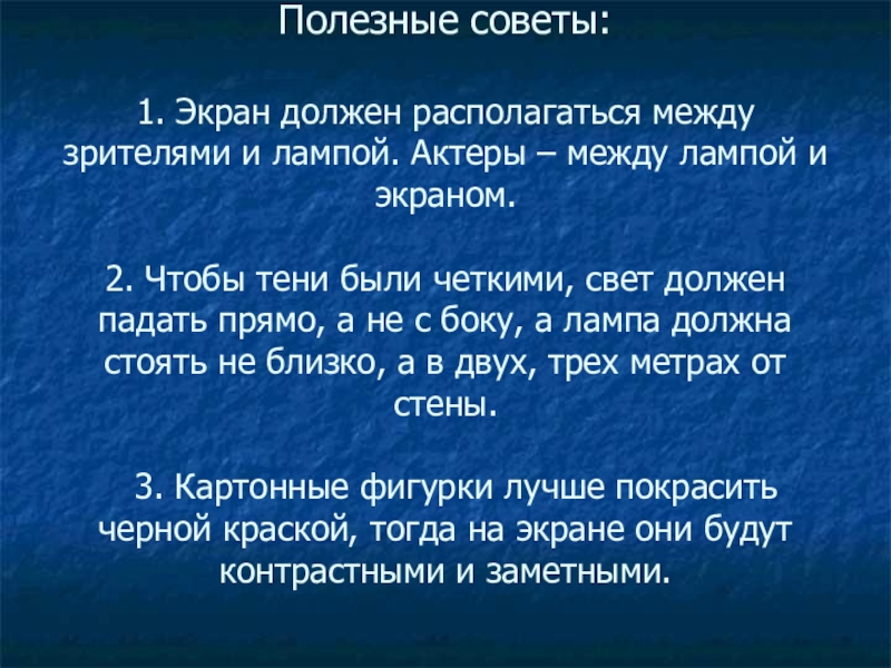 Слайд 6 Полезные советы: 1. Экран должен располагаться между зрителями и лампой. Актеры –