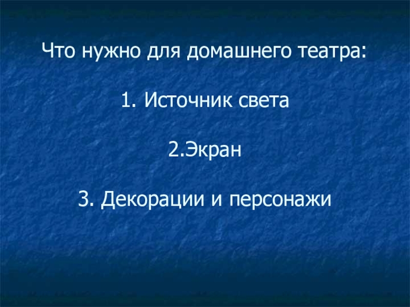 Слайд 5 Что нужно для домашнего театра: 1. Источник света 2.Экран 3. Декорации и персонажи