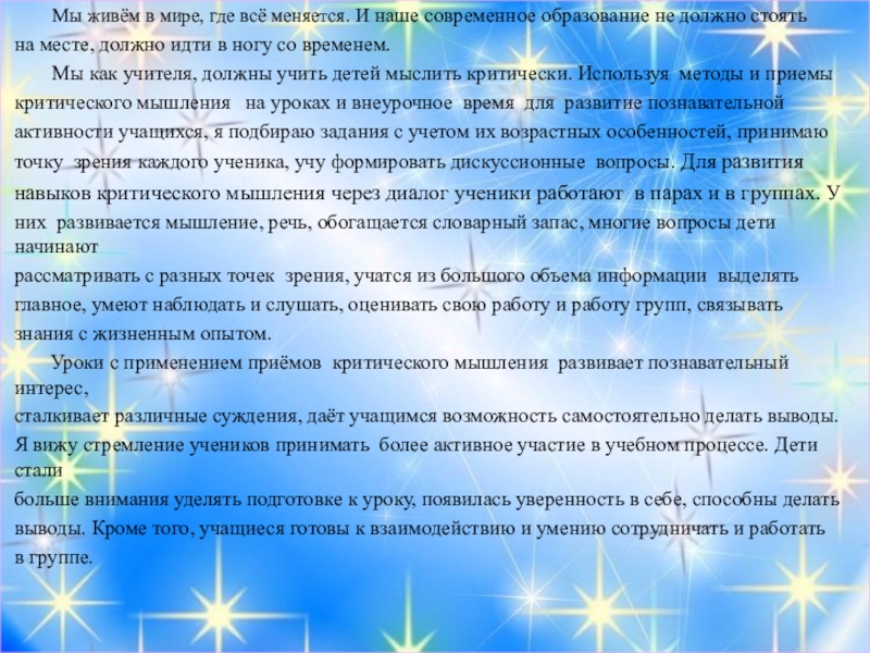 Тема. Как использование приёмов критического мышления влияет на повышение познавательной активности учащихся в начальных классах