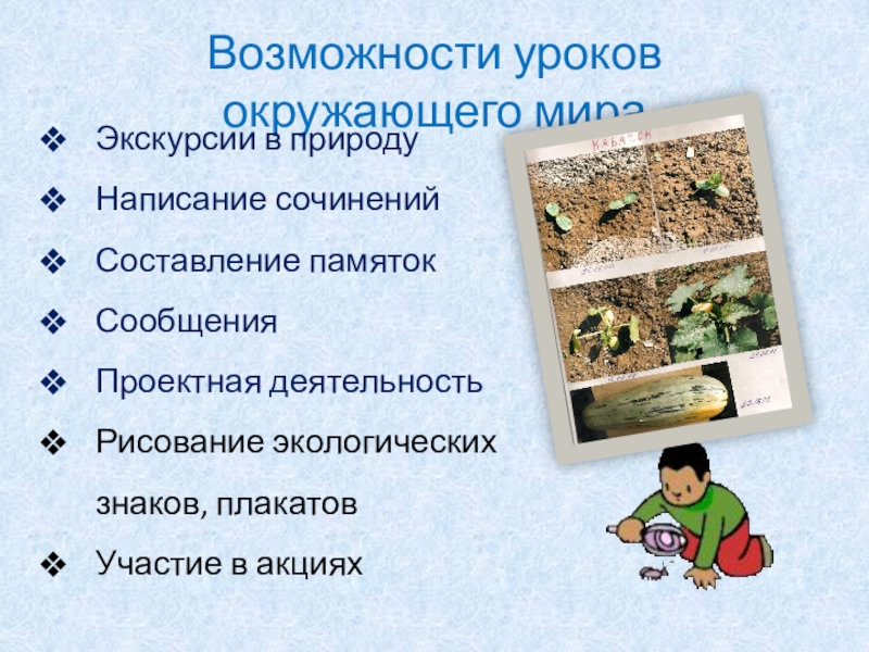 деятельность учащихся по подготовке докладов, бесед, лекций, наблюдения за животными и растениями; изготовление поделок, кормушек, скворечников, фотографирование, рисование, лепка.