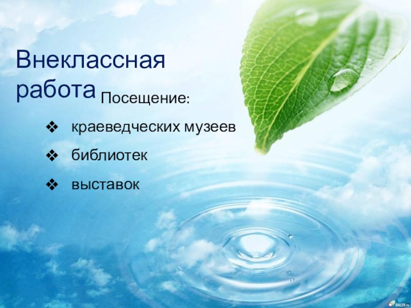 клубные, кружковые занятия юных друзей природы; факультативы по охране природы и основам экологии; кинолектории; экскурсии; туристические походы по изучению природы; экологический практикум.