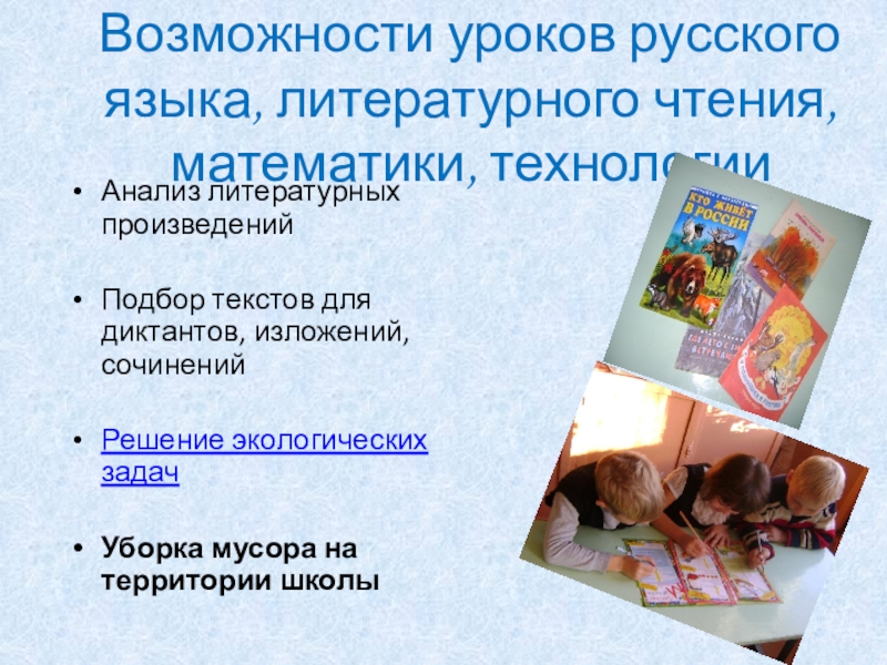 работа учащихся по благоустройству и озеленению помещений и территории школы, экологические фестивали, праздники, ролевые игры, работы на пришкольном участке.