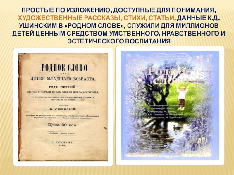 Простые по изложению, доступные для понимания, художественные рассказы, стихи, статьи, данные К.Д.Ушинским в «Родном слове», служили для
