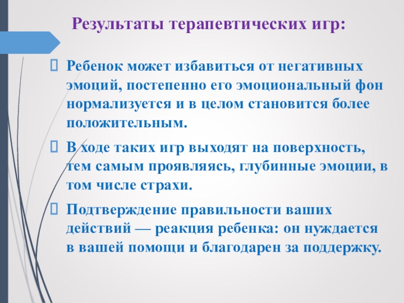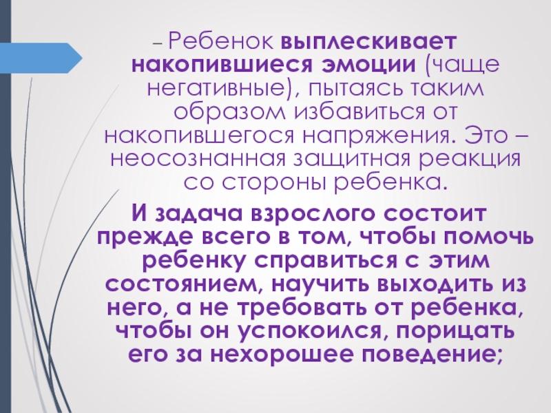 Слайд 8– Ребенок выплескивает накопившиеся эмоции (чаще негативные), пытаясь таким образом избавиться от накопившегося напряжения.