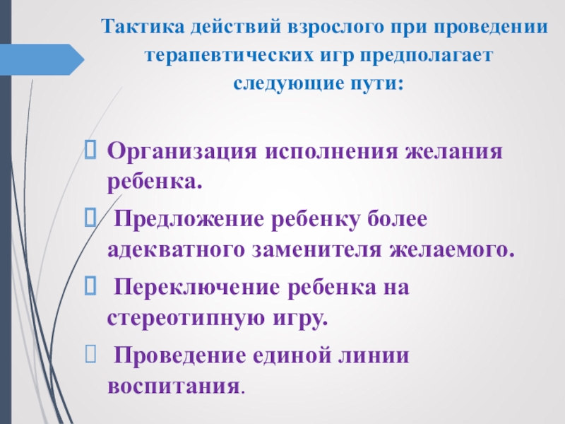 Слайд 13Тактика действий взрослого при проведении терапевтических игр предполагает следующие пути: