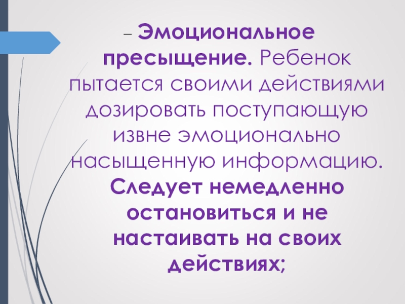 Слайд 6– Эмоциональное пресыщение. Ребенок пытается своими действиями дозировать поступающую извне эмоционально насыщенную информацию.