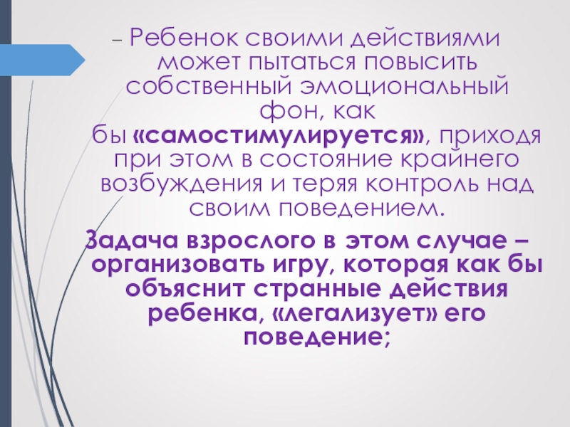 Слайд 7– Ребенок своими действиями может пытаться повысить собственный эмоциональный фон, как бы «самостимулируется»,